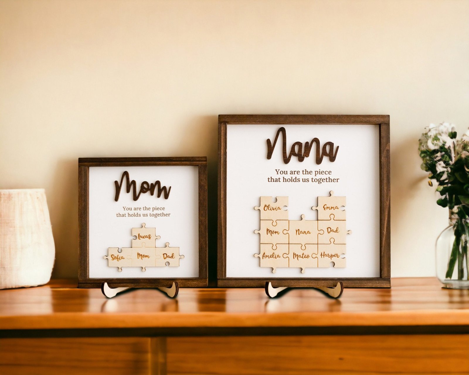 The Mama Puzzle Piece Sign is more than just home décor—it’s a symbol of love, unity, and appreciation. Designed to reflect the powerful role a mother plays in holding her family together, this handcrafted sign combines elegant design with deep emotional value. Featuring a customizable set of puzzle pieces engraved with children’s or family members’ names, this heartfelt piece is ideal for Mother’s Day, birthdays, Christmas, or any time you want to show your gratitude to the matriarch in your life.